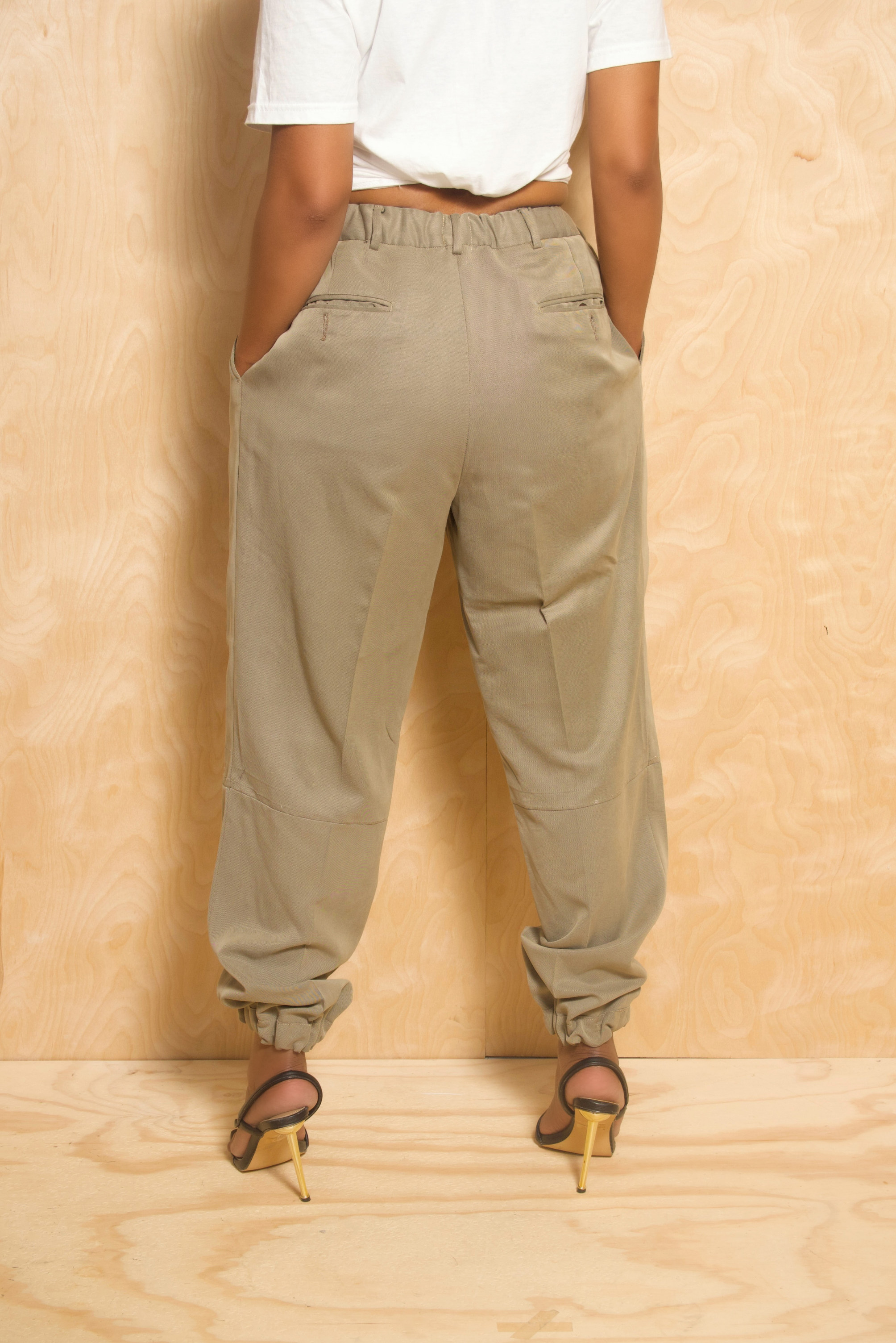 These Sage Tan Jogger Slacks offer a sophisticated twist on classic joggers. Reworked from vintage fabrics by iAMMI, they feature a soft sage tan hue that complements any wardrobe. Elastic waist and cuffed ankles ensure comfort without compromising style. The relaxed fit pairs perfectly with fitted tops or casual layers for a versatile look. Thoughtfully hand-finished details make each piece truly unique. Perfect for fashion-forward individuals seeking comfort and originality.