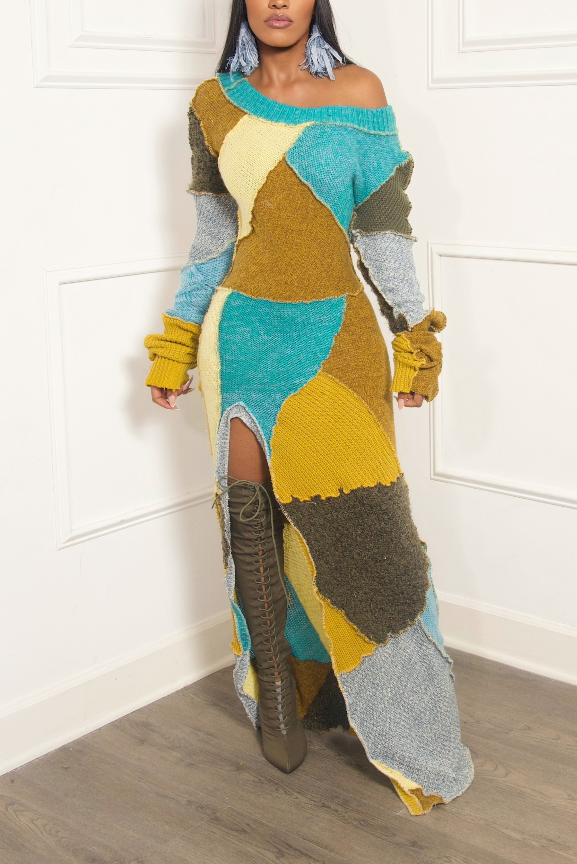 *Mustard Patchwork Upcycled Knit Sweater Dress (M/L)