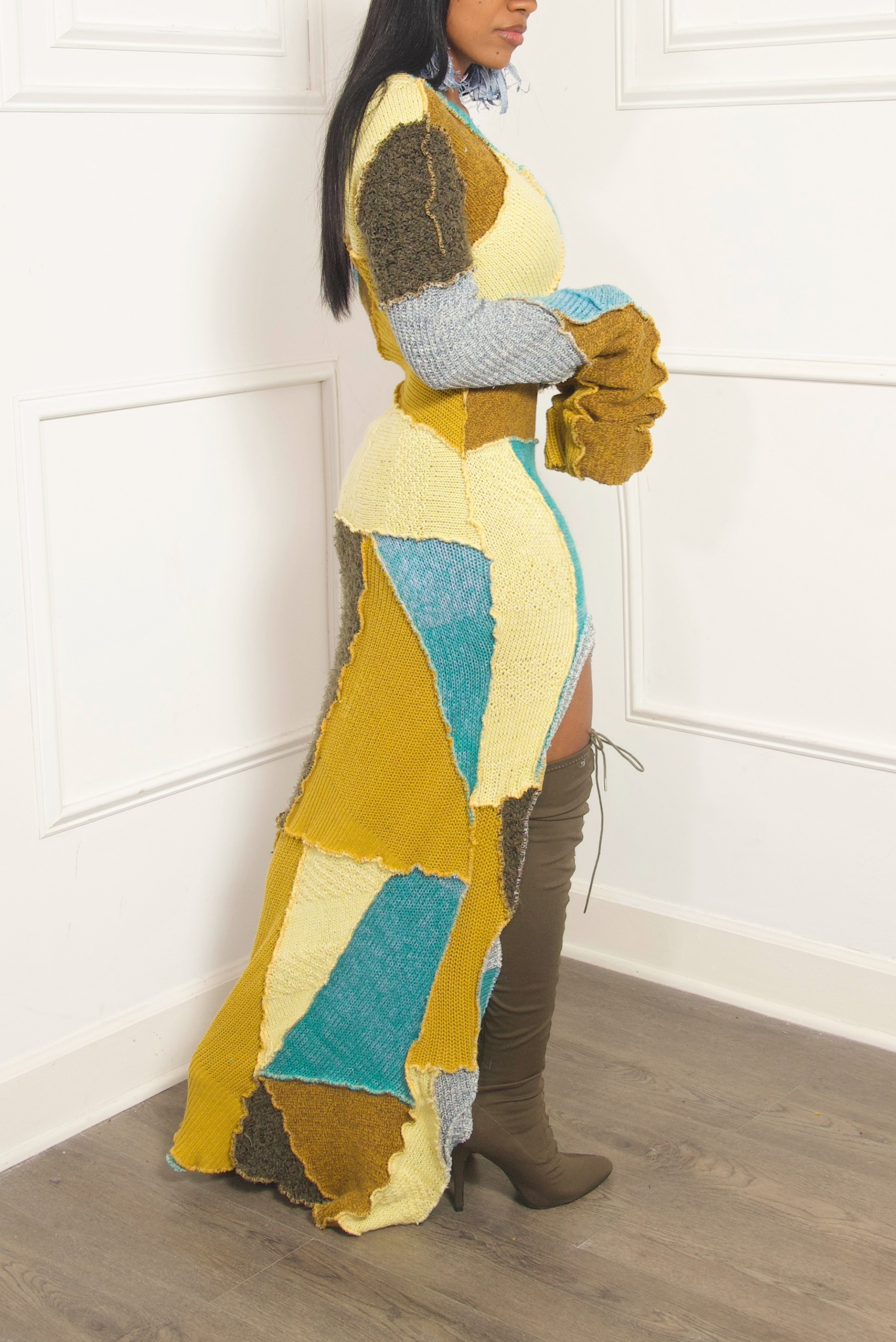 Crafted from ten different vintage sweaters, this mustard patchwork knit sweater dress showcases intentional color variation and artisanal construction. Handmade in the USA, each dress reflects the beauty of slow fashion through its carefully pieced sweater scraps. The rich mustard tones add warmth and depth while highlighting the individuality of every knit section. Because this piece is fully upcycled, no two dresses will ever be identical. Designed to stand apart from fast fashion, it represents sustainability without compromising style. Each dress requires more than ten hours of meticulous handwork.