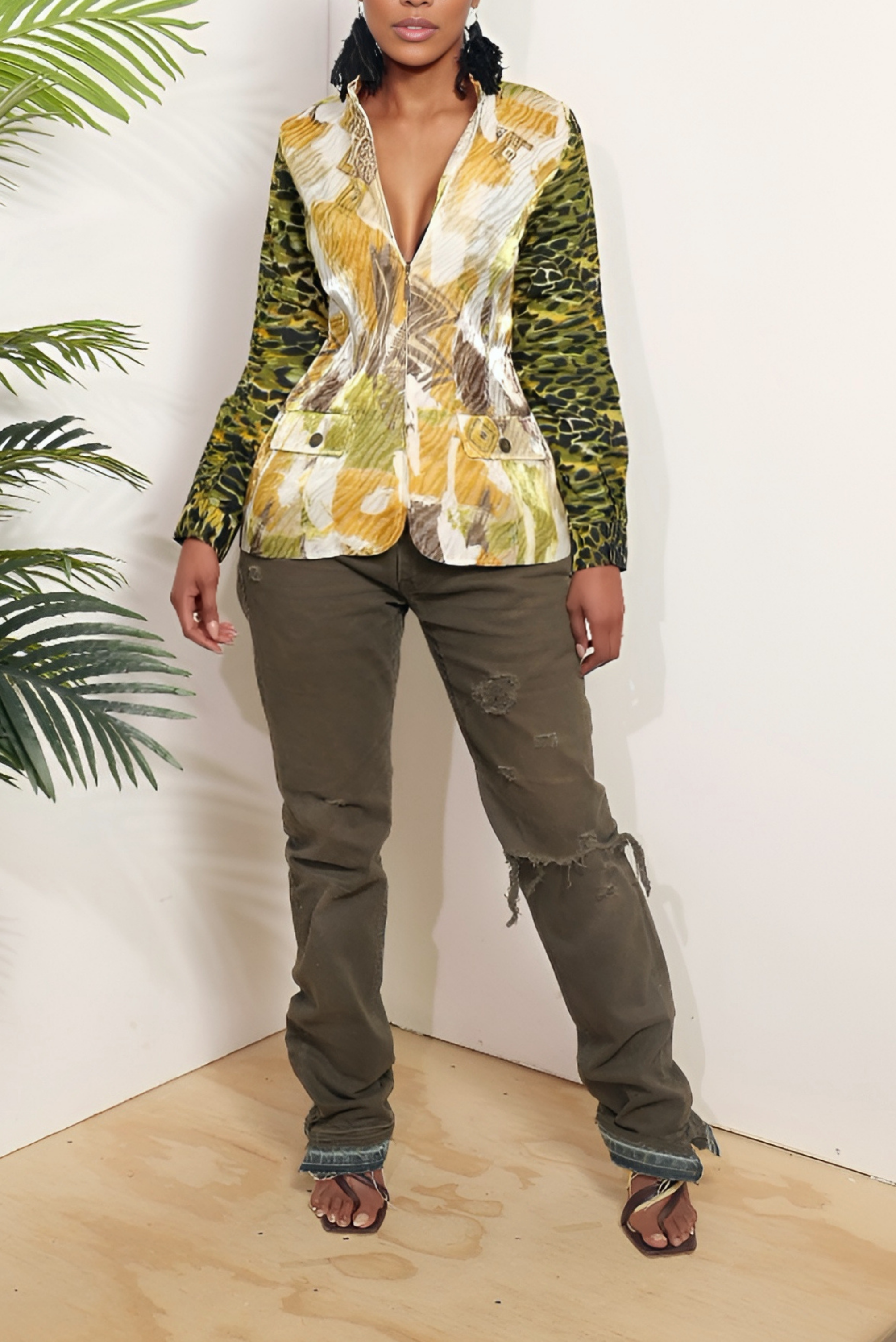 *Yellow/Green Leopard Print Zip-Up Long Sleeve Blouse M/L - FINAL SALE