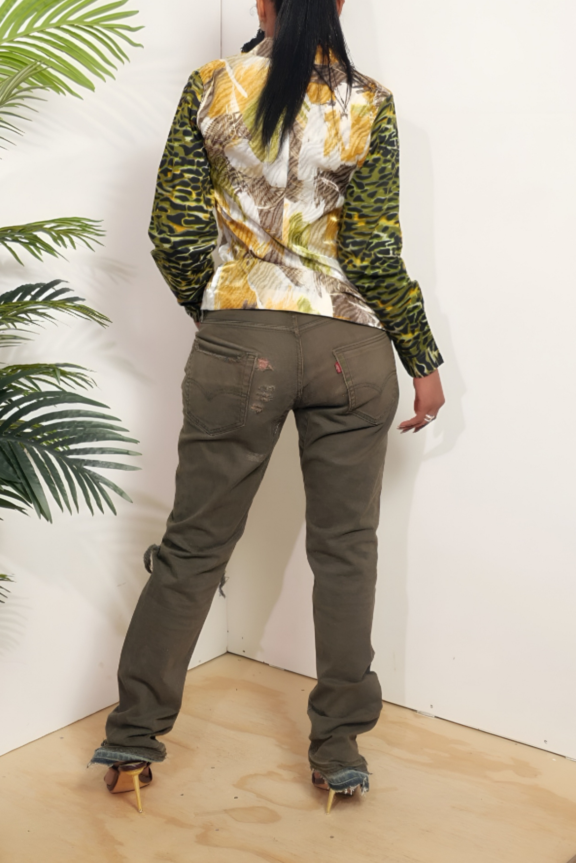 Make your presence known in this custom vintage Yellow/Green Leopard Print Zip-Up Long Sleeve Blouse by iAMMI a statement piece designed for those who refuse to dress like everyone else. This vivid yellow-and-green leopard print radiates confidence and creativity in a way only vintage fashion can deliver. The zip-up front adds a sleek, modern edge while long sleeves keep the look refined and wearable through multiple seasons. Every stitch is intentional handcrafted by iAMMI from a single, vintage fabric source, meaning this is a truly exclusive, limited piece. Style it open over a coordinating set or zipped up as a standalone bold top. Your wardrobe deserves this rare, stunning vintage find.