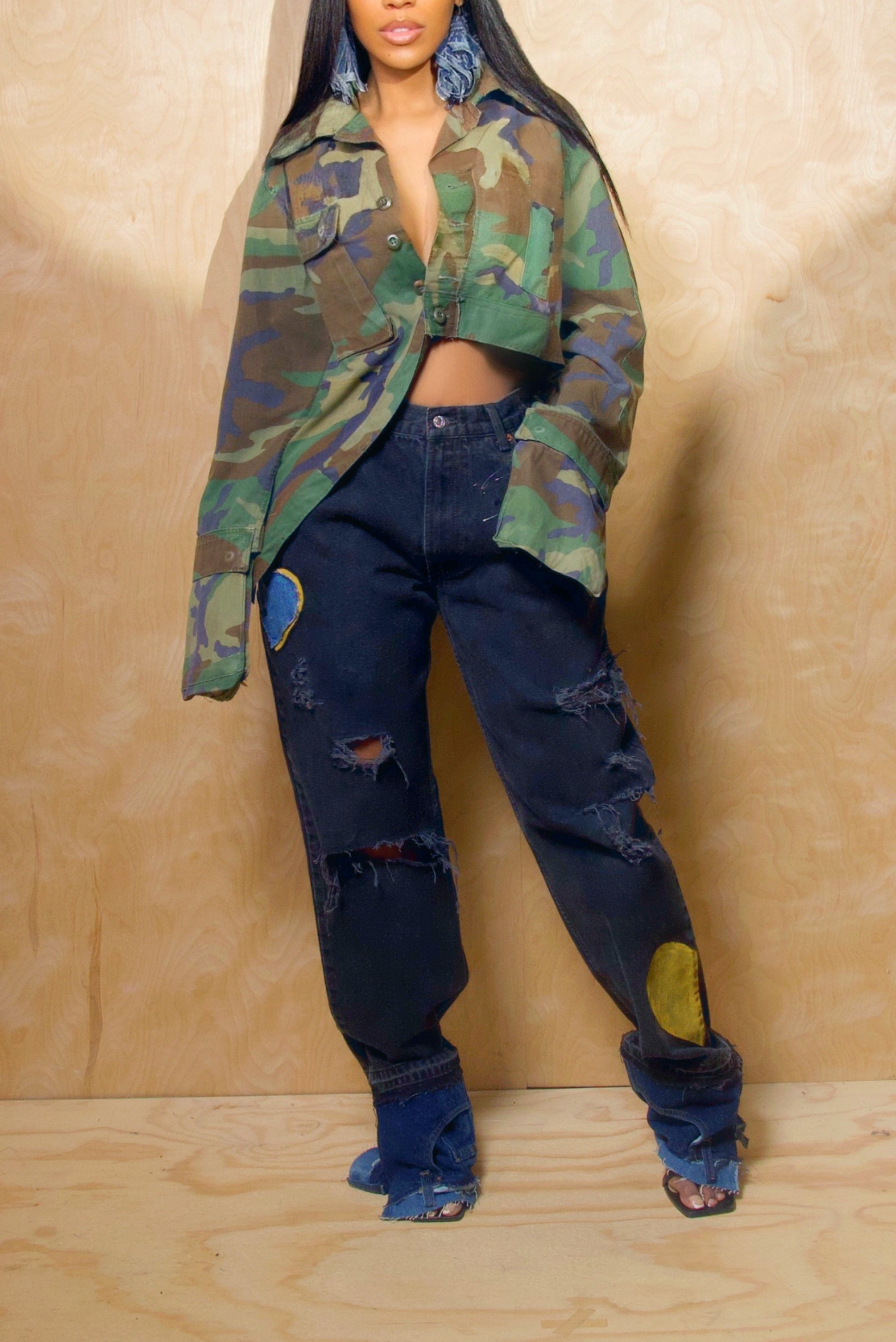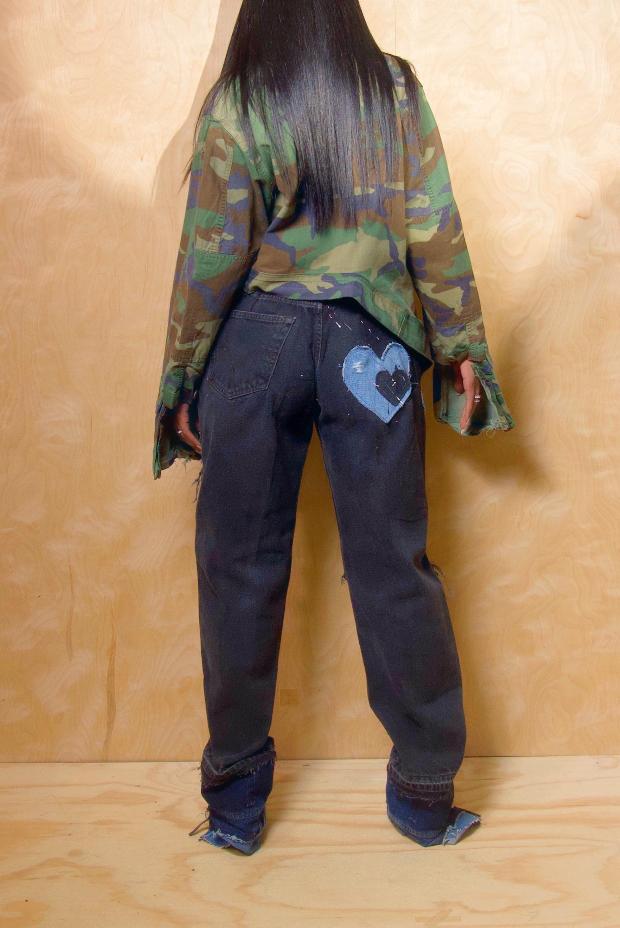 This vintage camo jean jacket is upcycled and reworked into an eye-catching asymmetrical design. Made with authentic camo fabric, it carries a bold, rugged character while feeling modern and intentional. The asymmetrical cut adds movement and edge to a classic denim silhouette. Custom made by iAMMI, each jacket has its own unique personality. A statement outerwear piece that stands out effortlessly.