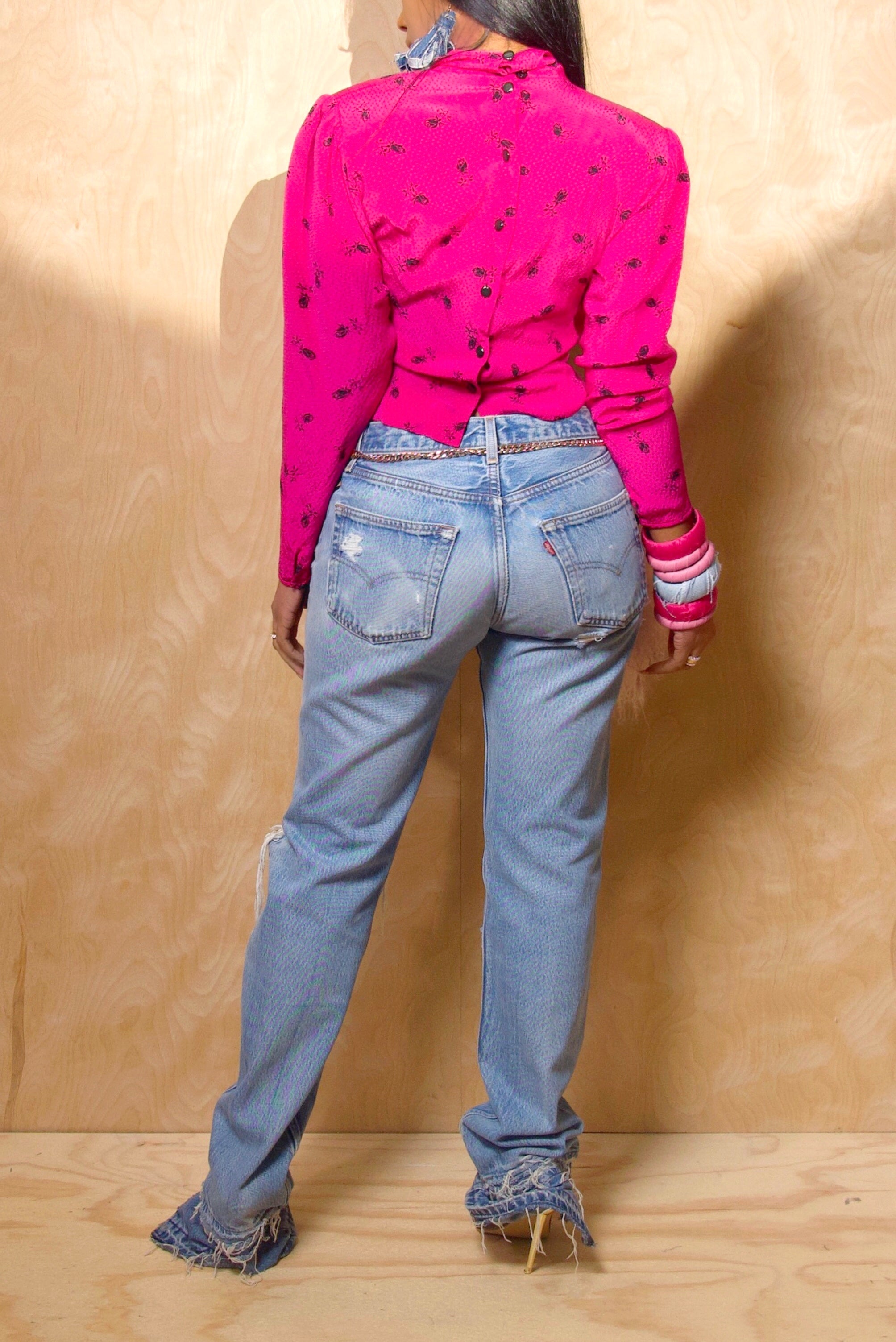 This vintage top is crafted from 100% silk, offering a smooth, luxurious feel with an elegant drape. Structured shoulder pads create a bold silhouette, balanced by the softness of the fabric. The backward button detail adds a unique and fashion-forward element. Its soft pink shade enhances the refined look. A timeless vintage piece that feels elevated and distinctive.