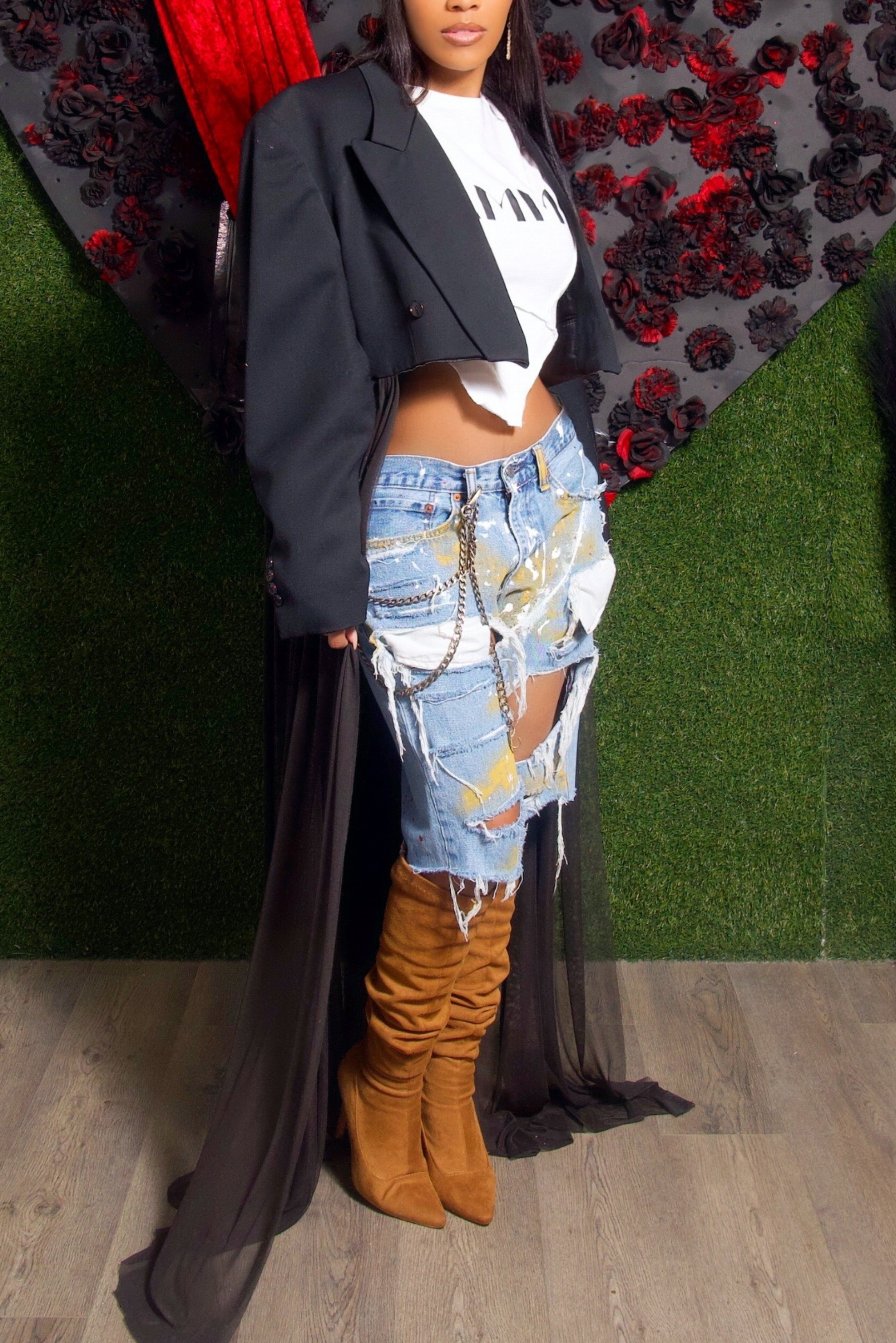 Add a touch of rebellious charm to your wardrobe with these bold red, white, and gold paint splattered distressed Bermuda shorts. Custom-made by the skilled team at iAMMI, this one-of-a-kind piece boasts its unique blend of edgy and elegant design. Perfect for music festivals or casual outings, these shorts add a touch of attitude to any outfit.