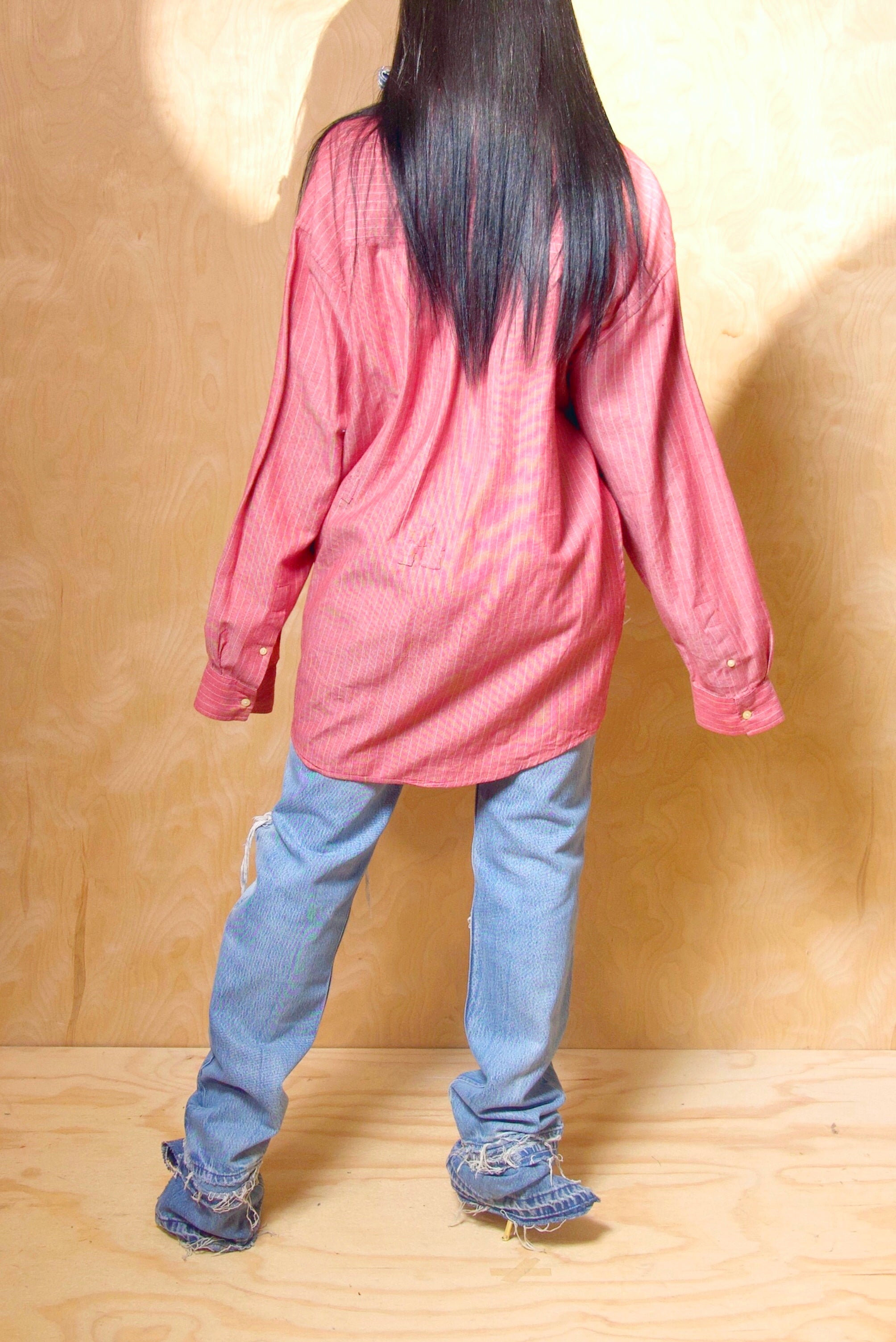 This vintage reddish button-up shirt features a split crossover front that elevates its overall design. Crafted from cotton, it provides a breathable and comfortable fit. The rich reddish tone adds depth and character. Custom made by iAMMI, it’s tailored with thoughtful details that stand out. A versatile piece that brings vintage charm to modern styling.