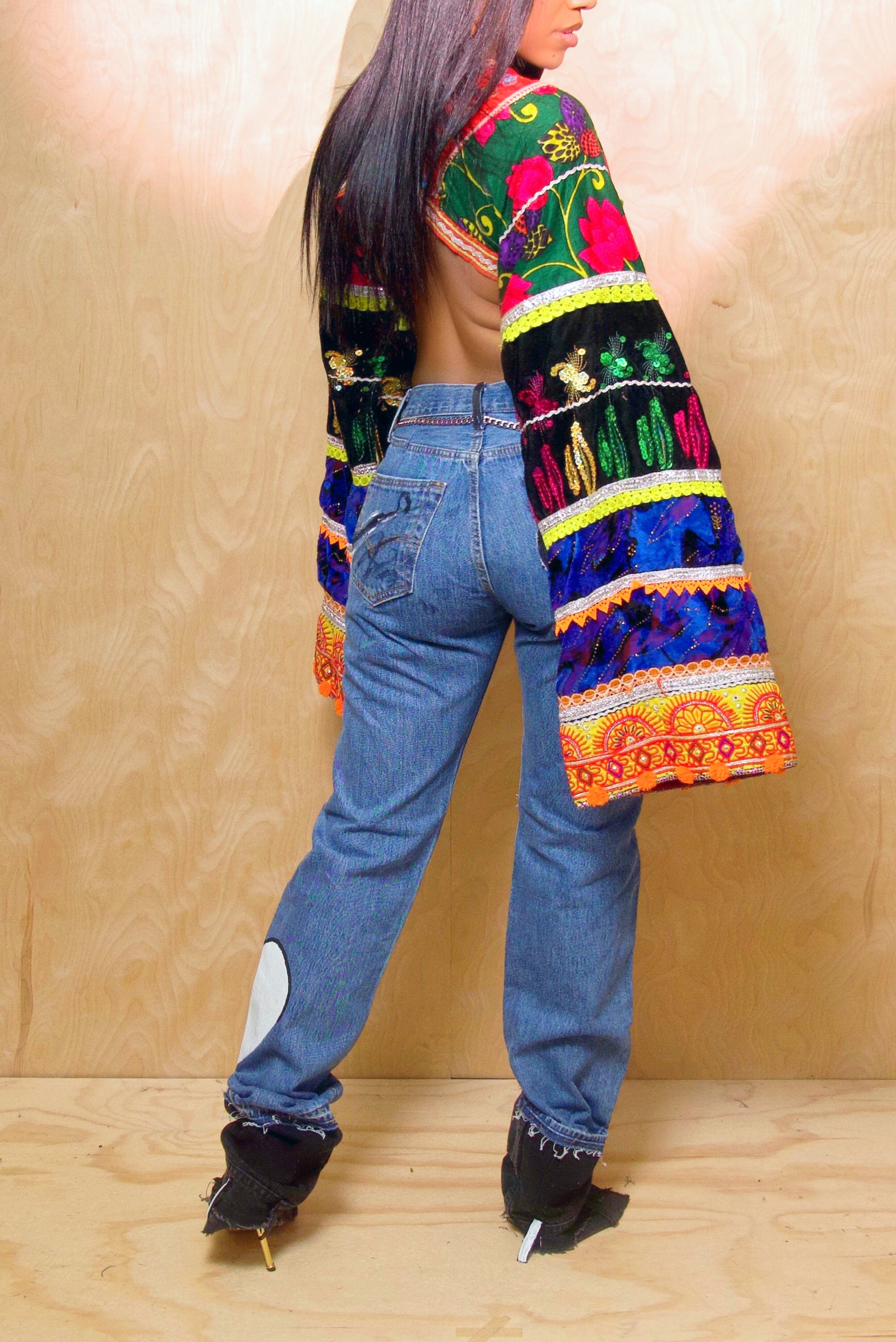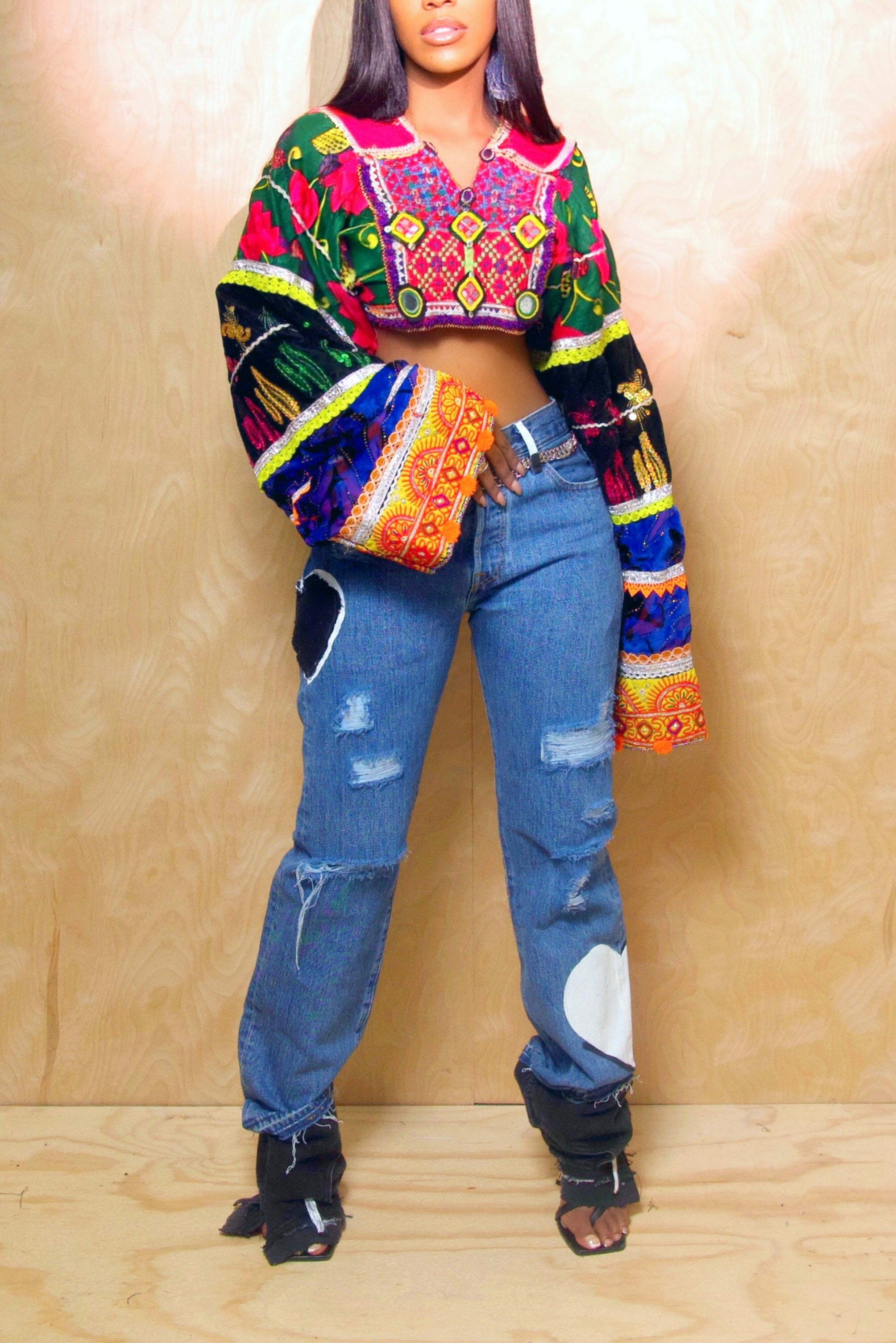 This vintage tribal floral cropped top features eye-catching floral motifs inspired by traditional design. The cropped cut adds a modern balance to the detailed pattern. Lightweight and comfortable, it’s easy to wear throughout the day. As a vintage piece, it offers individuality and character. Perfect for adding texture and interest to any outfit.