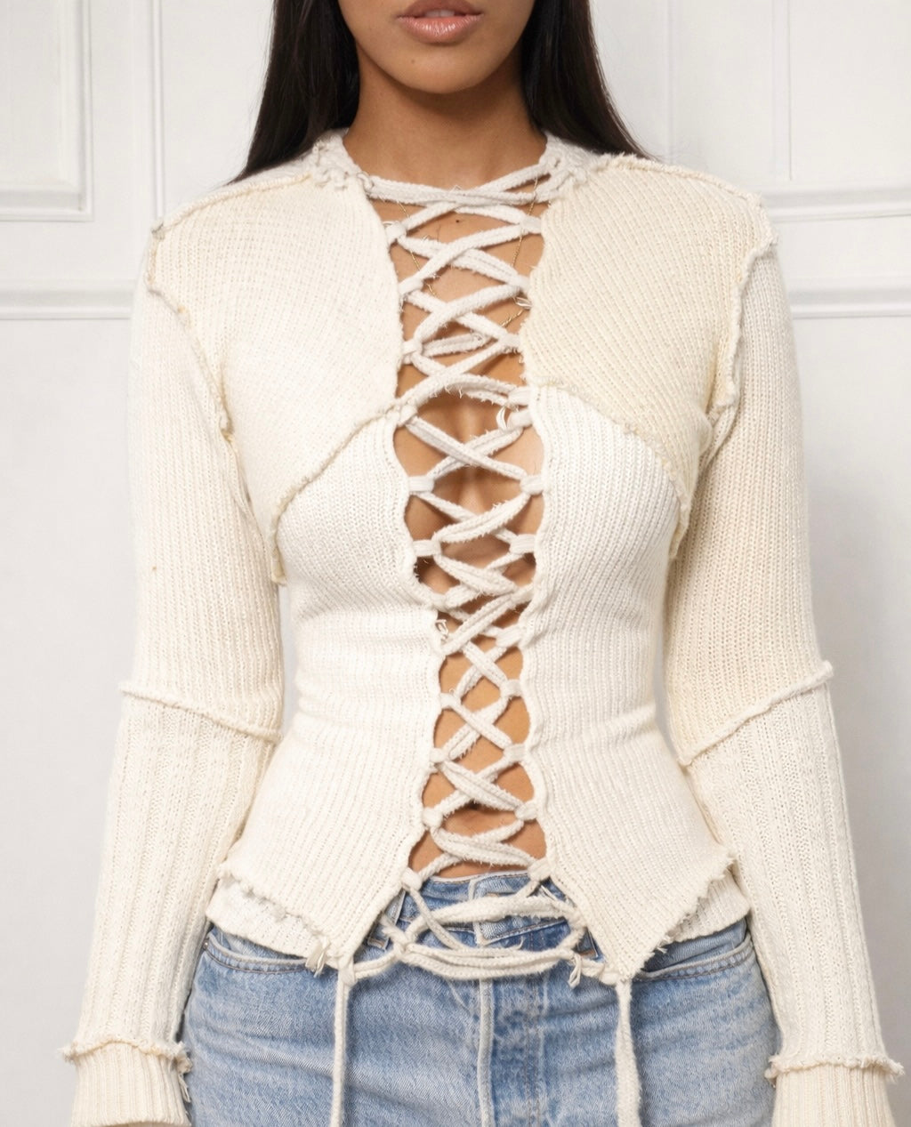 Cream & off white Lace Up Upcycled Knit Patchwork Sweater (L/XL)